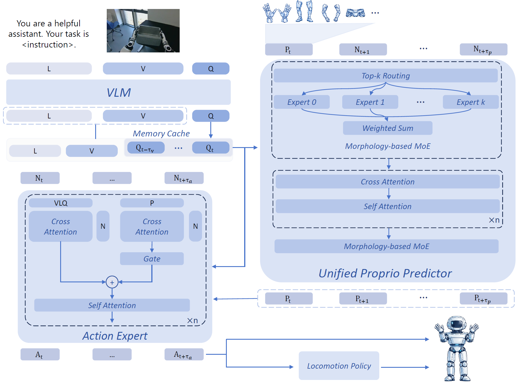 HEX is a humanoid-aligned VLA framework that introduces retrospective execution context and prospective dynamic conditioning for robust cross-embodiment control. HEX employs a dual cross-attention action head that separately attends to visual-semantic representations from a vision–language model and short-horizon dynamic cues derived from future state prediction. A residual gating mechanism adaptively fuses the two branches, allowing the policy to balance semantic intent and dynamic feasibility based on the robot's condition, while a subsequent self-attention layer enforces temporal coherence across the action sequence.