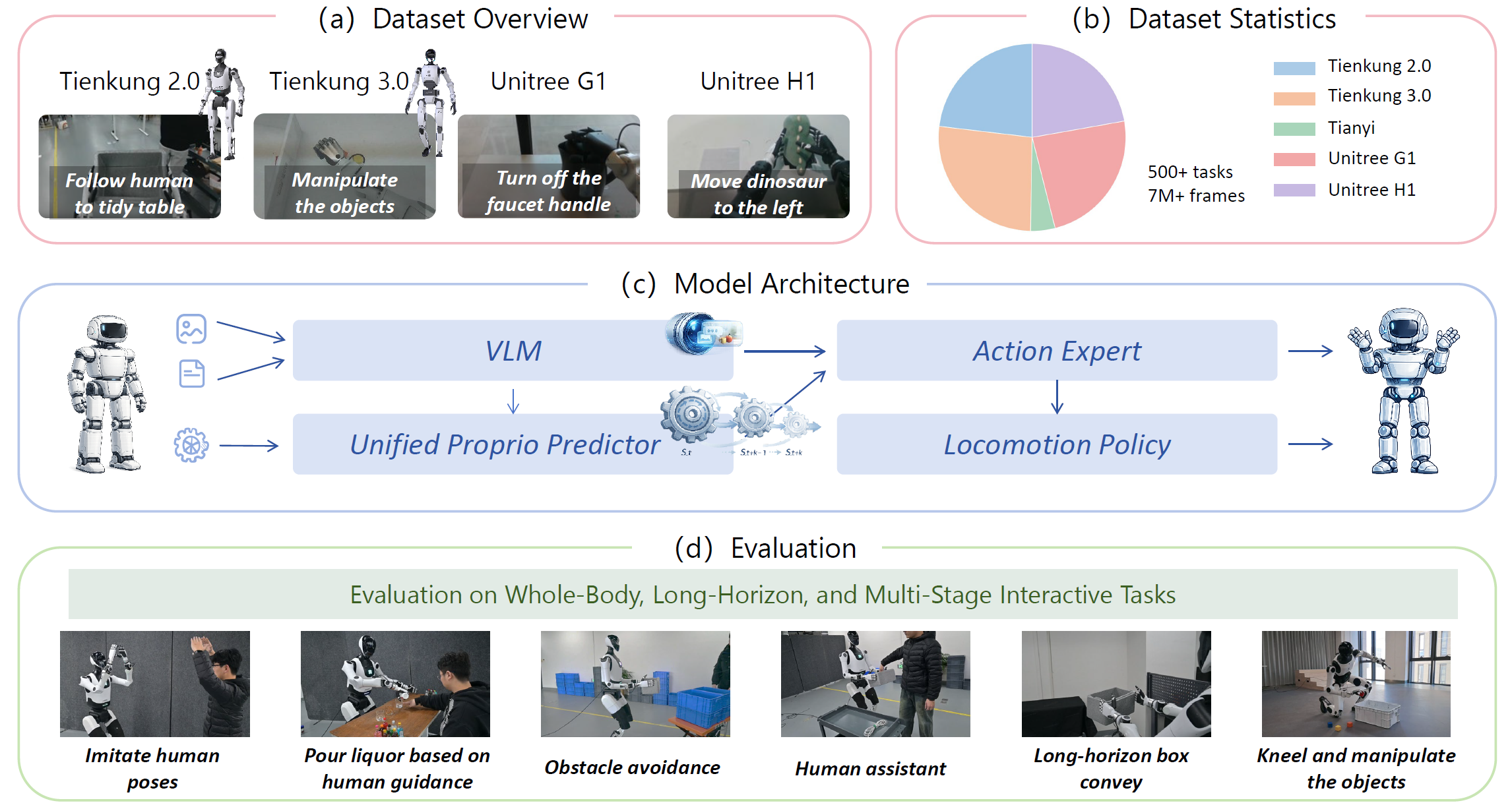 To enable cross-embodiment transfer, HEX represents humanoid states using part-based abstractions with a lightweight mixture-of-experts for embodiment alignment and pretraining across heterogeneous platforms.